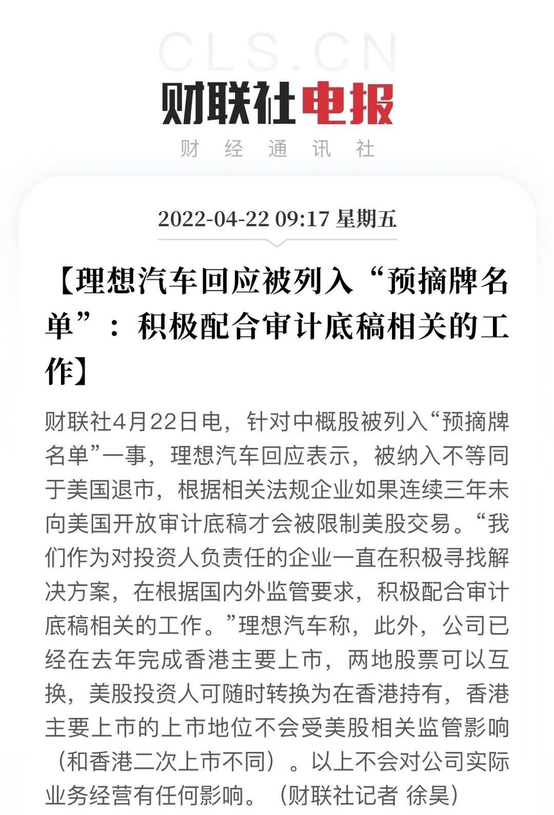 4月21日,美国证券交易委员会(SEC)宣布,理想汽车(LI-US)以及瑞幸咖啡等17家企业被列入“预摘牌”名单中,SEC称,被列入“预摘牌”名单中的公司提交申辩的截止时间为当地时间5月12日。按照SEC官网上的法律文件,被列入“确定摘牌名单”的公司需要在(自披露第一份年报开始计算、且2021年当作第一年)三年内提交SEC需要的文件。如果“确定摘牌名单”中的公司没有提交或提交的文件不符合SEC要求...