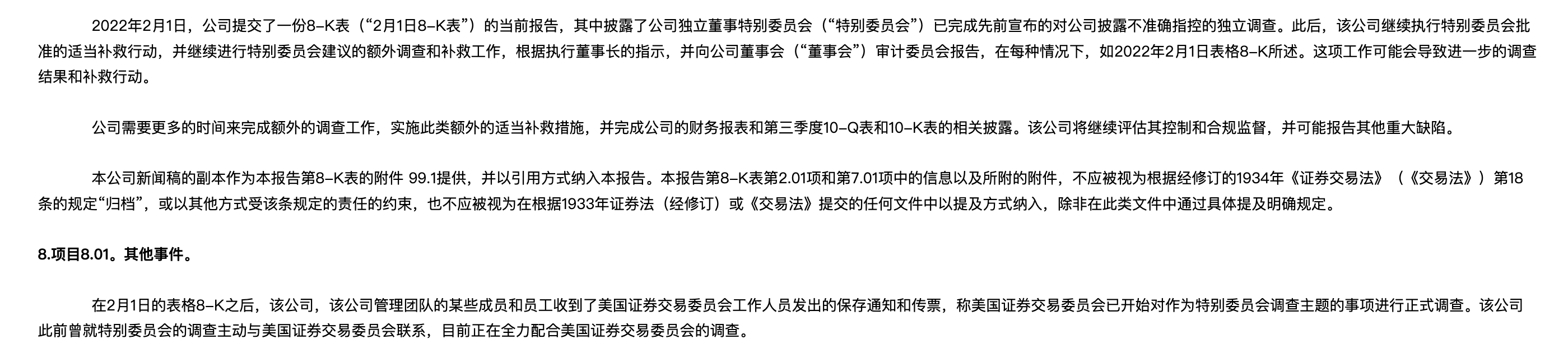 当地时间周四,美国电动汽车公司法拉第未来汽车向美国证券委员会(SEC)提交的监管备案文件中,承认公司管理团队的某些成员和公司员工收到了美国SEC工作人员的保全通知和传票,遭遇调查的原因是法拉第未来公司涉嫌向投资者发布不准确信息。法拉第未来表示,此前曾就特别委员会的调查主动与美国证券交易委员会联系,目前正全力配合美国证券交易委员会的调查。此外,法拉第未来还称,由于内部调查造成延误,预计无法在最后期限...