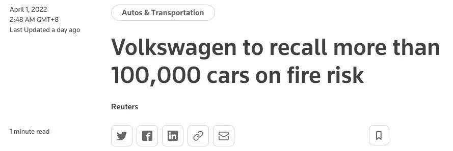 据路透社报道,3月31日,德国汽车制造商大众汽车集团发言人表示,因存在起火风险,大众将在全球范围内召回超100000辆插电式混合动力汽车。本次召回的10万辆车型涉及大众集团旗下众多品牌,包括大众、奥迪、西雅特和斯柯达等车型。其中,大众品牌将在全球范围内召回42300辆汽车,涉及帕萨特(Passat)、高尔夫、途观(Tiguan)和Arteon等车型;大众奥迪品牌将召回24400辆汽车。对此,德国汽...