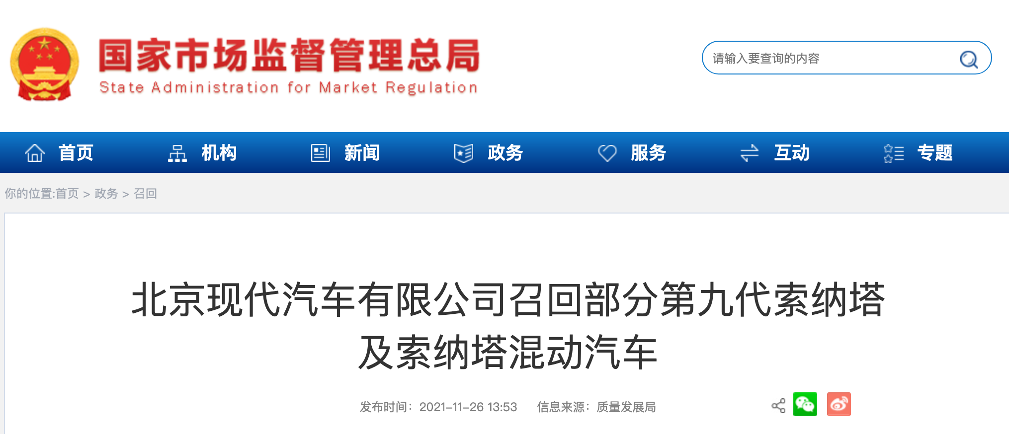 日前,北京现代汽车有限公司根据《缺陷汽车产品召回管理条例》和《缺陷汽车产品召回管理条例实施办法》的要求,向国家市场监督管理总局备案了召回计划。决定自即日起,召回(一)2014年10月9日至2017年10月7日期间生产的第九代索纳塔汽车,共计88995辆。(二)2015年5月27日至2018年9月12日期间生产的第九代索纳塔混合动力汽车,共计5530辆。召回原因:本次召回范围内的车辆由于智能接线盒(...