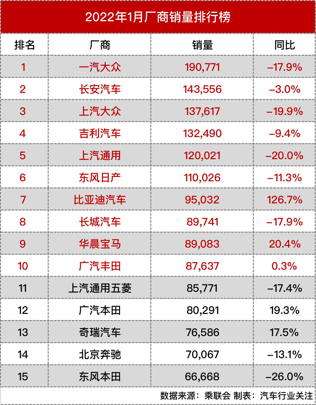 受元旦、春节假期以及上游市场芯片短缺影响,多家车企开年首月销量普跌。从汽车行业关注总结的各大车企销售情况来看,合资品牌在首月表现并不乐观,比如一汽-大众、上汽大众、上汽通用、东风日产、东风本田均跌超两位数,自主阵营中比亚迪和奇瑞汽车则再次大涨,而一线豪华品牌华晨宝马首次挤进前十。具体来看,2022年1月共有六家车企销量超过十万辆,分别是一汽-大众、长安汽车、上汽大众、吉利汽车、上汽通用、东风日产,...