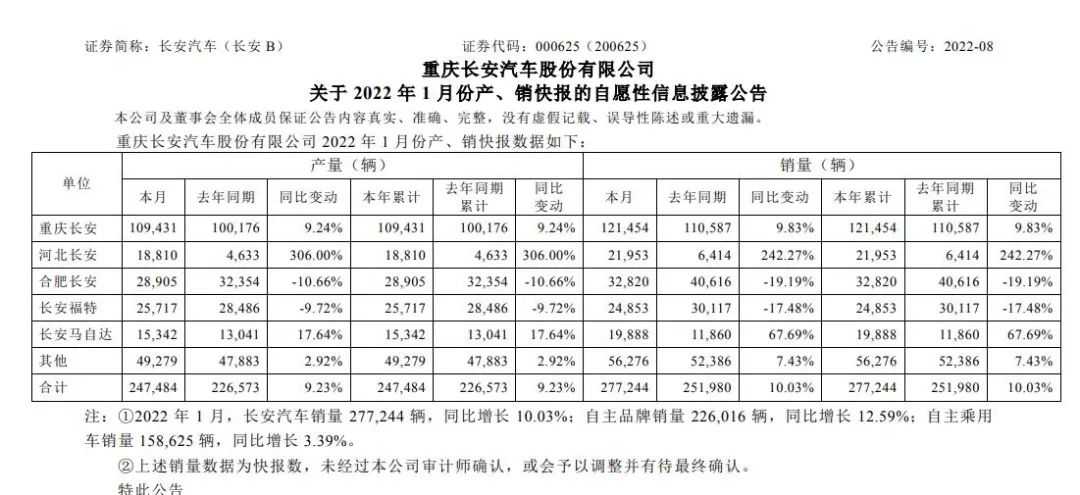 2月14日,长安汽车对外公布其2022年1月产销数据。从长安汽车公布的2022年1月的销量情况看,长安汽车1月销量为277244辆,同比增长10.0%。其中自主品牌销量为226016辆,同比增长12.6%;自主品牌乘用车销量为158625辆,同比增长3.4%,此外,蓝鲸家族销量突破13万辆,蓝鲸双雄CS75系列和CS55销量均突破3万辆。在长安自主品牌乘用车中,从具体车型上看,在SUV销量方面,长...