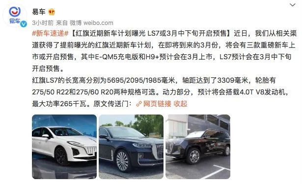 一汽红旗新车计划曝光,据了解,一汽红旗将在3月份推出3款新车,这三款新车分别为E-QM5充电版、H9+、LS7,其中E-QM5充电版和H9+预计在3月上市,LS7预计在3月中下旬开启预售。据了解,红旗E-QM5定位纯电中型轿车,于去年6月22日正式售价公布,车辆售价23.98万元,动力方面,新车采用了单电机前驱布局,电动机功率100千瓦,NEDC续航里程431公里,搭载比亚迪生产的磷酸铁锂电池组,...