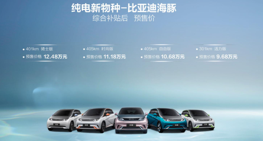 8月12日,比亚迪汽车正式公布旗下新车型“海豚”预售价格区间为9.68—12.48万元,新车将推出骑士版、时尚版、自由版、活力版四个版本,新车或在9月份正式上市。据了解,作为比亚迪将推出的全新车型,比亚迪海豚基于比亚迪e平台3.0打造,未来将在比亚迪e网进行销售。比亚迪海豚采用与现售车型完全不同的设计风格,是比亚迪海洋系列的首款车型。从外观来看,比亚迪海豚采用了十分圆润的车身设计,前脸采用了封闭式...