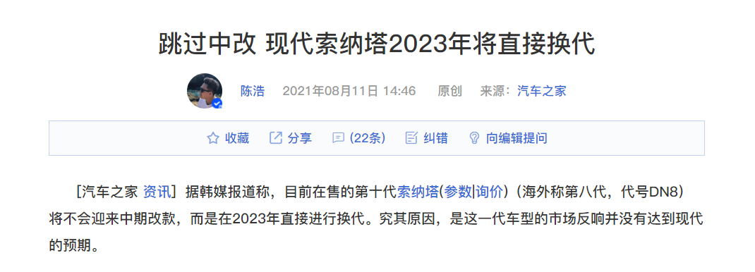 据媒体报道,目前在售的第十代索纳塔将不会迎来中期改款,而是计划在2023年直接进行换代。至于为何跳过中期改款直接换代,有分析认为主要是由于现售车型的外观设计没有达到消费者的认可,导致销量不佳,为了解决这一问题,现代决定将索纳塔的换代时间大幅提前。2019年4月,全新索纳塔正式发布,整体的观感更加圆润,融入了轿跑车设计元素。其采用了“SensuousSportiness”设计语言,大尺寸的六边形进气...