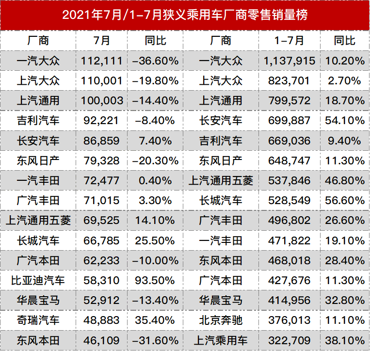 8月10日,乘联会发布最新报告显示,2021年7月狭义乘用车零售为150.0万辆,同比下降6.2%;2021年1-7月累计销量为1144.5万辆,同比增长22.9%。从乘联会公布的狭义乘用车厂商零售销量数据来看,前十五排名中多家车企销量出现不同程度下滑,特别是一汽-大众、上汽大众、上汽通用、东风日产等主流汽车制造商,销量均出现大幅下滑。从榜单来看,前三车企依旧是一汽-大众、上汽通用和上汽大众,三家...