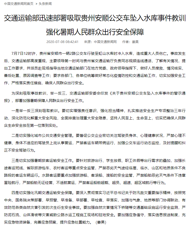 贵州省安顺市公交车坠湖事件引发重大人员伤亡的事件引发关注。针对公交车坠湖事件,交通运输部安委会印发《关于贵州安顺公交车坠入水库事件的警示通报》,部署加强暑期保障人民群众出行安全工作。《通报》中指出,要督促公交企业密切关注驾驶员身体、心理健康状况,严禁心理不健康、身体不适应的驾驶员上岗从事营运,严禁客运车辆带病运行,加强公交车运行动态监控,及时提醒和纠正不安全驾驶行为。以下是《通知》具体内容:一是举...