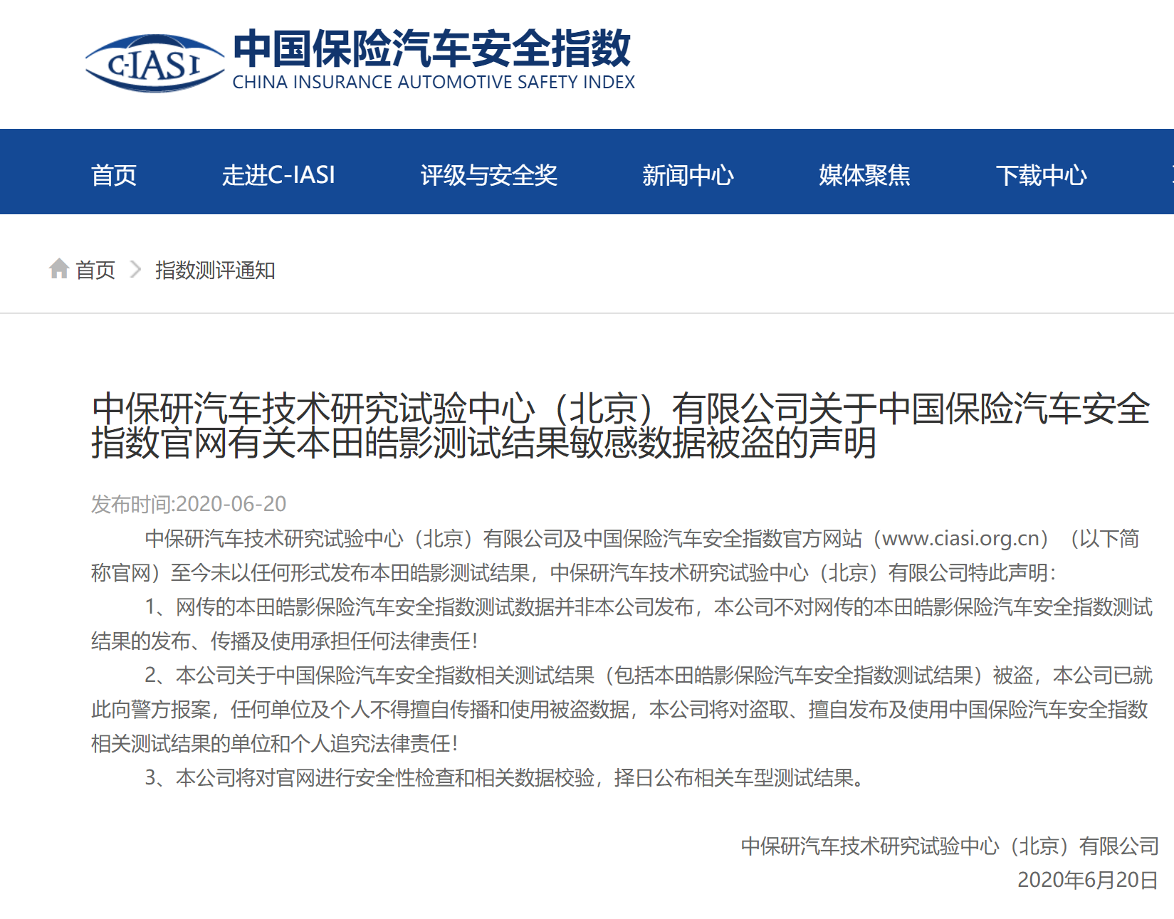 汽车行业关注(autochat.com.cn)06月21日报道——针对近期有消息指出中保研C-IASI公布了皓影车型的碰撞测试成绩但结果发布后网页消失一事,中保研官方发布声明称,官网至今未以任何形式发布本田皓影测试结果,系数据被盗,已报警。附:中保研汽车技术研究试验中心(北京)有限公司关于中国保险汽车安全指数官网有关本田皓影测试结果敏感数据被盗的声明中保研汽车技术研究试验中心(北京)有限公司及中国...
