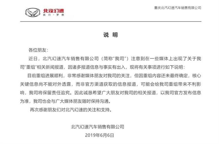 汽车行业关注(autochat.com.cn)06月06日报道——北汽银翔旗下的汽车品牌——北汽幻速,于6月6日发布一则通告表示,目前重组进展顺利,但因重组内容还未最终确定,关键信息尚不能对外透露。欢迎订阅微信公众号《汽车行业关注》,第一时间汽车行业内幕消息,一起说说汽车圈子那些事。欢迎爆料!微信号autoWechat