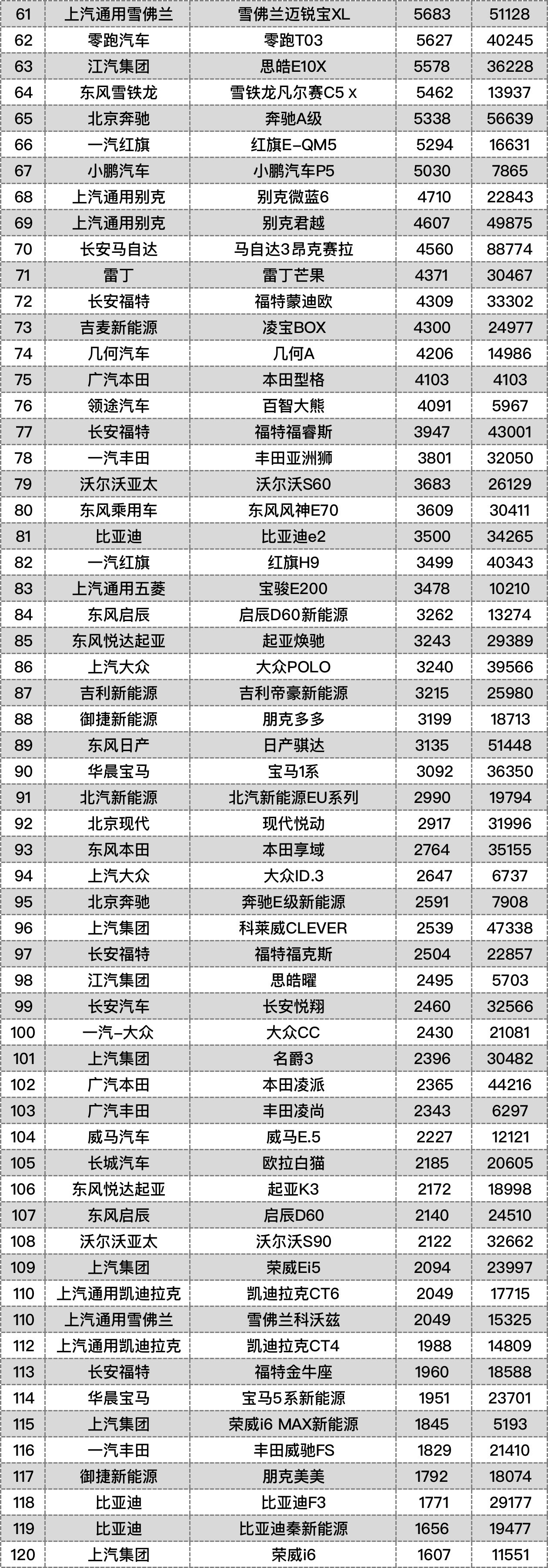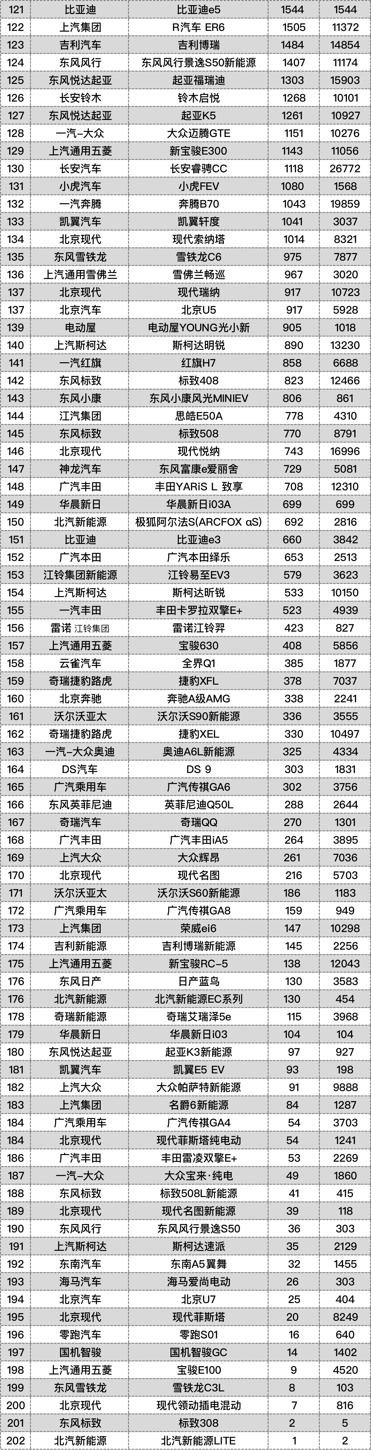 2021年12月SUV榜:1、哈弗H6 42787辆;2、特斯拉Model Y 40558辆;3、名爵ZS 23292辆;4、大众途岳 21491辆;5、本田XR-V 20895辆;6、本田CR-V 19857辆;7、比亚迪宋新能源 19172辆;8、五菱星辰 19073辆;9、吉利博越 19048辆;10、奇瑞瑞虎8 18526辆;