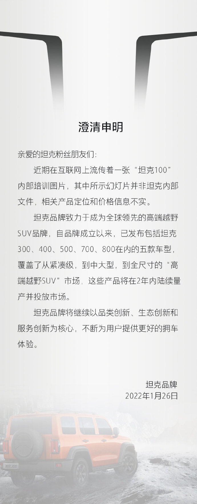 1月26日晚,坦克品牌发布澄清声明:近期在网上流传着一张“坦克100”内部培训图片,其中所示幻灯片并非坦克内部文件,相关产品定位和价格信息不实。坦克品牌已发布包括坦克300、400、 500、 700、 800在内的五款车型,覆盖了从紧凑级,到中大型,到全尺寸的“高端越野SUV”市场,这些产品将在2年内陆续量产并投放市场。