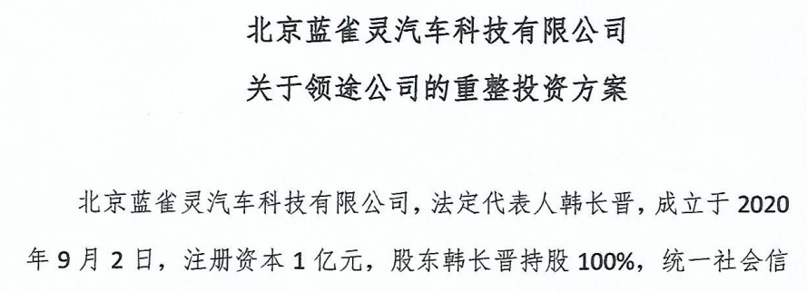 天眼查显示,北京蓝雀灵成立于2020年9月2日,注册资本1亿元,由韩长晋全资控股。根据介绍,北京蓝雀灵已经对领途汽车未来运营做出战略规划。从《重整计划草案》来看,提高管理水平、加大研发投入、加大品牌推广和渠道拓展投入、剥离不良资产、实施股权激励等都成为未来经营方案的核心。其中,明确重整后的领途公司将聚焦A00级智能网联新能源乘用车,覆盖购车、租金、金融、充换电的新型汽车消费生态,预计2021到2023年实现产品销售分别达到1万台、5万台和8万台,销售额分别达到3.5亿元、17.5亿元和30亿元。