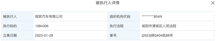 1月28日,天眼查信息显示,观致汽车有限公司(下称“观致汽车”)新增多则被执行人信息,执行法院包括咸阳市渭城区人民法院、新昌县人民法院、苏州市中级人民法院等,执行标的合计2.5亿余元。