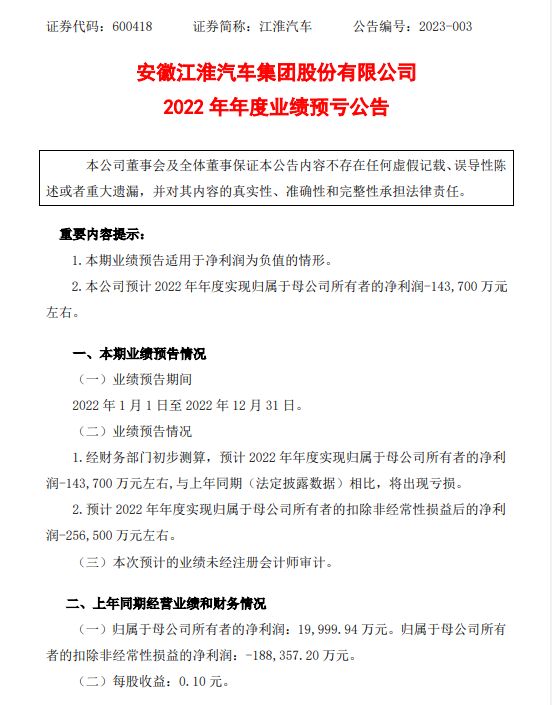 江淮汽车虽然左拥大众,右抱蔚来,但是市场表现却不乐观。由于国内商用车市场惨淡,江淮在2022年依旧亏损。据江淮汽车发布2022年年度业绩预亏公告显示:预计2022年年度实现归属于母公司所有者的净利润亏损14.37亿元,而上年同期净利润约2亿元。2022年年度销售各类汽车及底盘50.04万辆,同比下降4.54%,主营业务毛利较上年同期减少约2.95亿元。对于2022年业绩预亏,江淮汽车表示主要原因是受疫情和芯片短缺影响。