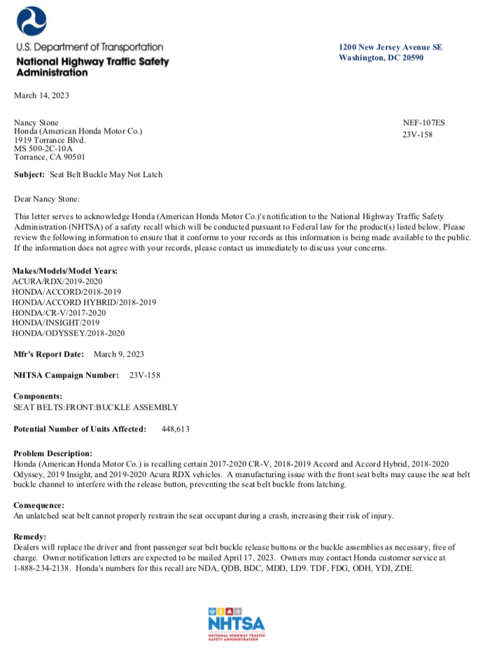 据了解,本田汽车于2019年6月意识到车辆安全带锁扣可能存在缺陷,此后展开调查,并于今年3月2日最终确定这一安全隐患。截至今年3月2日,本田汽车已收到301起与上述相关缺陷有关的保修索赔,但好在到目前为止没有收到任何因上述缺陷有关的伤亡报告。
