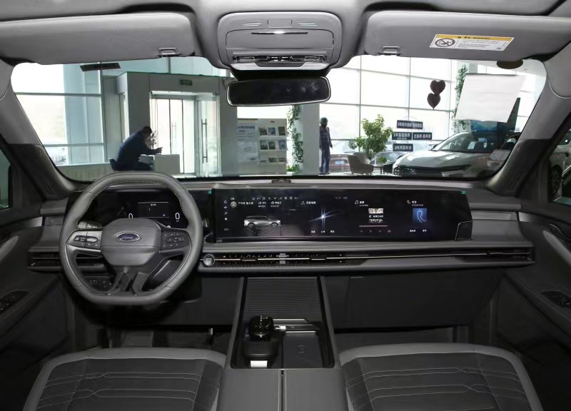 内饰部分,新车变化也比较大,新车采用最新的家族化设计,普通版车型采用米色与黑色相间色彩搭配,ST-Line车型则采用全黑色内饰并搭配大量红色纹理。配备上,新车配备由12.3英寸全液晶仪表和27英寸中控大屏组成的1.1米大联屏,大部分功能都集中在中控屏上,减少了物体实体按键的出现,搭配贯穿式空调出风口设计,视觉效果相对出众。另外新车还配备福特最新样式的运动风格方向盘,全新设计的悬浮电子挡杆。座椅布局方面,新车主打大空间,采用2+2+3和2+3+2两种不同形式的七座布局。