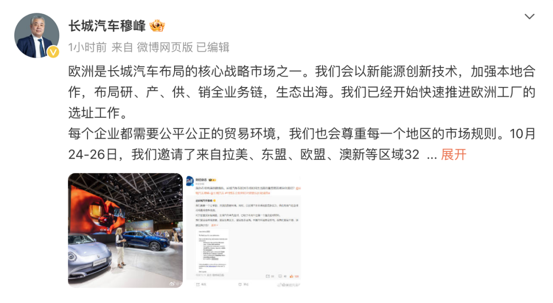 10月23日,长城汽车总裁穆峰也发博表示,对于欧盟反补贴调查,长城汽车率先应对,已经于本月11日第一个提交应对材料。其称,我们需要一个公平的、开放的贸易环境。同时,以长城汽车体系化的竞争实力,我们有底气在全球市场赢得竞争优势。我们坚定全球化发展,坚定长期主义,坚定生态出海。中国汽车出海会坎坷,但我们坚定不移,加速出海步伐!