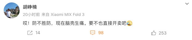 针对小米汽车白车身遭泄露一事,小米汽车高管胡峥楠发文表示:“防不胜防,现在脑壳生痛。要不也直接开卖吧。”而在这条微博下也引发网友广泛关注。