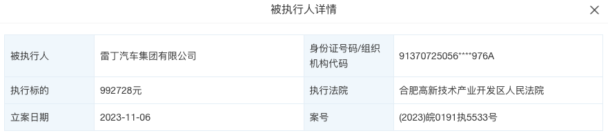 《汽车行业关注》从天眼查信息了解,11月4日,雷丁汽车集团有限公司(下称“雷丁汽车”)新增一则被执行人信息,执行标的992728元,执行法院为合肥高新技术产业开发区人民法院;11月6日,雷丁汽车再新增一则被执行人信息,执行标的34894432.0元,执行法院为青岛市崂山区人民法院。
