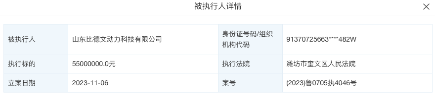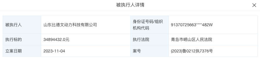 除此之外,雷丁汽车子公司山东比德文动力科技有限公司也接连被执行。11月4日,山东比德文动力科技有限公司新增一则被执行人信息,执行标的34.89万元,执行法院为青岛市崂山区人民法院;11月6日,山东比德文动力科技有限公司新增一则被执行人信息,执行标的5500万元,涉及金融借款合同纠纷,执行法院为潍坊市奎文区人民法院。