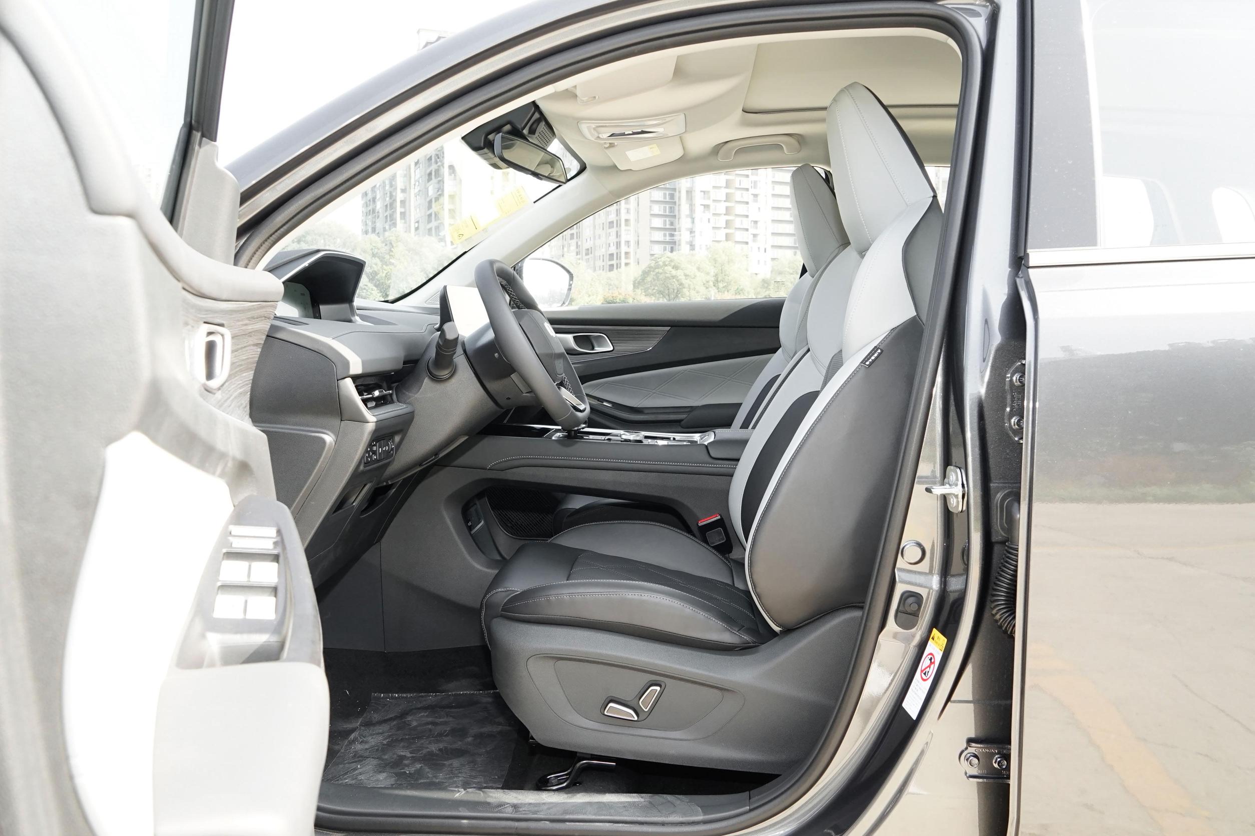 内饰部分,新车车内设计与长安第三代CS55 PLUS基本一致,整体设计风格相对简约,提供雅致棕、静谧灰两种内饰配色。搭载10.25英寸全液晶仪表与12.3英寸中控屏幕,方向盘更换为启源LOGO。另外,新车配备贯穿式空调出风口,中控台下部配有无线充电板。