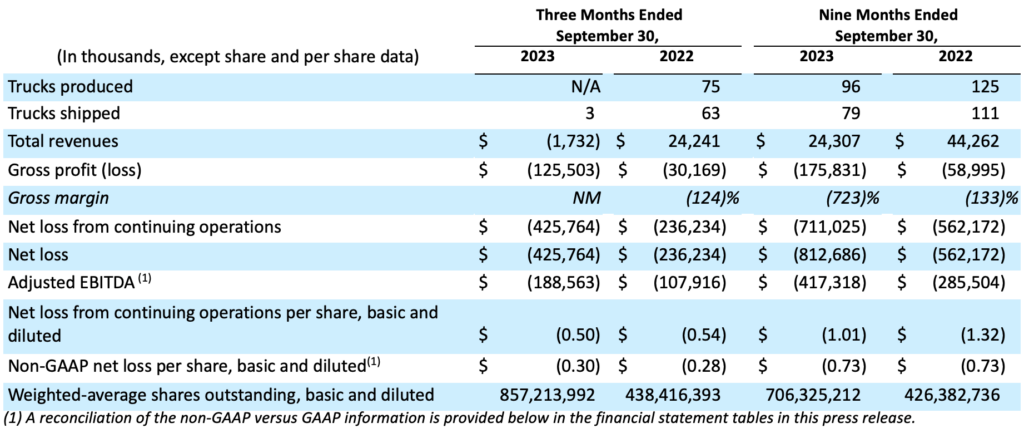 最新财报显示,2023年前三季度,Nikola实现营收2431万美元,上年同期为4426万美元;净亏8.13亿美元,上年同期为5.62亿美元。其中,第三季度Nikola营收为-173万美元,上年同期为2424万美元;净亏损为4.26亿美元,上年同期为2.36亿美元。