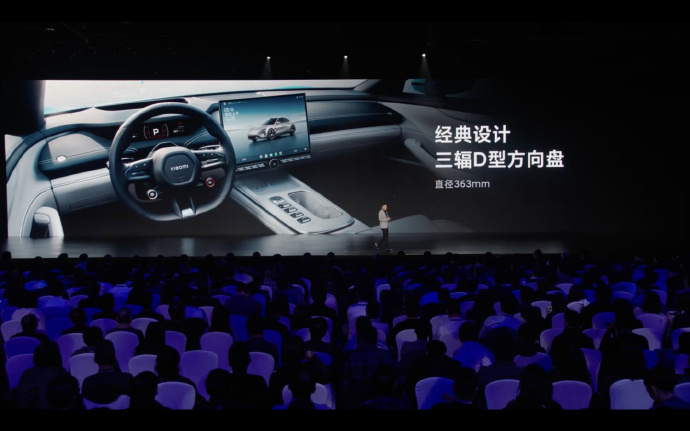 内饰部分,新车整体造型较简洁,采用环抱式座舱,提供银河灰、暮光红、曜石黑三种内饰配色。车内配备较大尺寸的中控屏,包括16.1 英寸中控屏、56 英寸的 HUD、7.1 英寸的仪表盘以及后排座椅两个小米平板,并保留部分物理按键,方向盘为经典的三幅D型方向盘设计,中间带有“xiaomi”拼音样式设计。