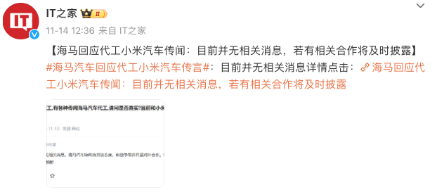 事实上,在此之前,11月市场也有传闻称,小米汽车将与海马汽车合作。针对该消息,海马汽车回应称,公司目前并无相关消息。海马汽车始终持开放态度,积极争取并开展对外合作。若有相关合作事项,公司将按规定履行信息披露义务。
