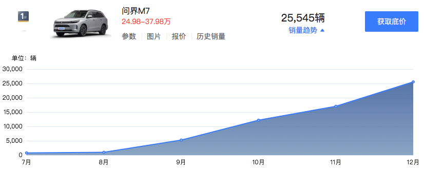 9月12日,AITO问界新M7正式发布并公布售价,新车提供大五座和六座两个版本,售价区间为24.98至32.98万元,新车较此前版本起售价直降7万元,而与2023年1月降价后的问界M7相比下调4万元。价格优势下,问界新M7销量逐渐攀升,9-11月零售销量分别为5248辆、12193辆和17039辆。
