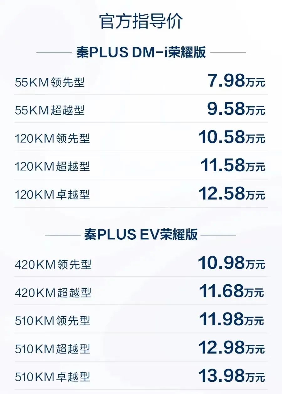 秦PLUS是比亚迪旗下紧凑型轿车,秦PLUS荣耀版于今日上市,其中,DM-i版本共推出5款车型,售价区间为7.98-12.58万元;EV版本共推出5款车型,售价区间为10.98-13.98万元。新车在车款、配置、动力等方面均与老款车型保持一致,但入门款车型起售价下降了2万元。作为对比,秦PLUS DM-i冠军版于2023年2月上市,售价为9.98万元-14.58万元。