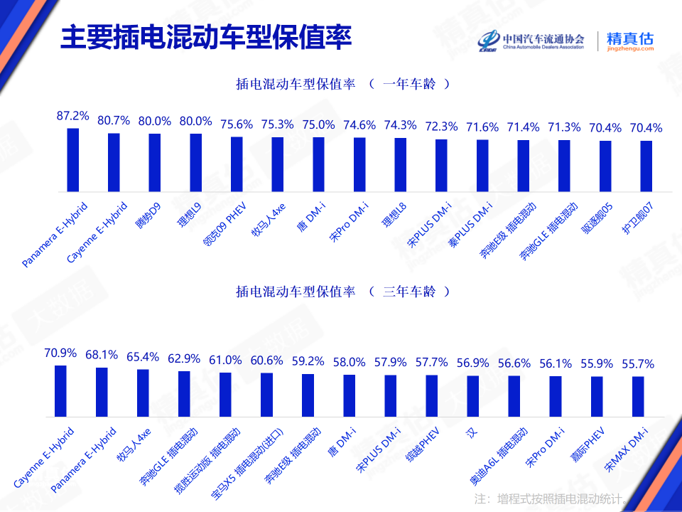 在插电混动榜单中,1年车龄的保值率插电混动车型排名前三分别为Panamera E-Hybrid、Cayenne E-Hybrid、腾势D9,此外,比亚迪多个插电混动车型位列榜单top15中;3年车龄的保值率插电混动车型排名前三分别为Cayenne E-Hybrid、Panamera E-Hybrid、牧马人4xe。