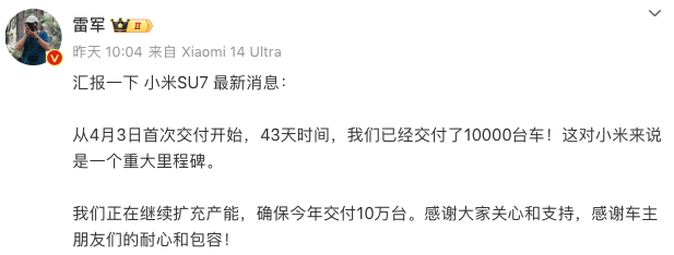 5月15日,小米汽车官宣,从4月3日正式开启交付至5月15日共计43天,小米汽车第10000辆小米SU7正式交付。随后小米创办人、董事长兼CEO雷军转发该条消息至个人微博并表示:感谢大家关心和支持,小米汽车正在继续扩充产能,确保今年交付10万辆新车。