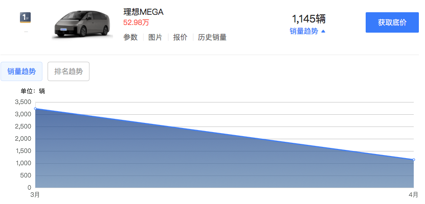 今年3月1日,理想MEGA上市,售价55.98万元,作为理想汽车旗下首款纯电动车和首款MPV车型,该车对理想汽车今年的发展至关重要,因此被寄予厚望,在李想看来,MEGA具备爆款的特质,有信心成为50万以上所有乘用车的销量第一,并为该车制定了激进的销量目标,但该车上市后未能达到李想预期中的效果。零售数据显示,今年3月和4月,理想MEGA销量分别为3229辆和1145辆。