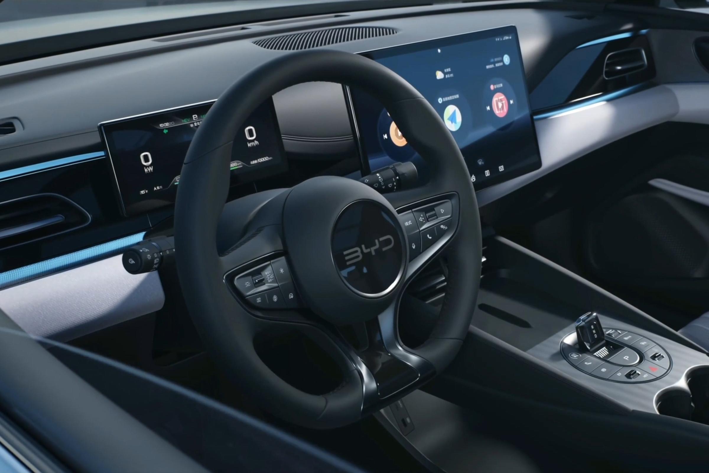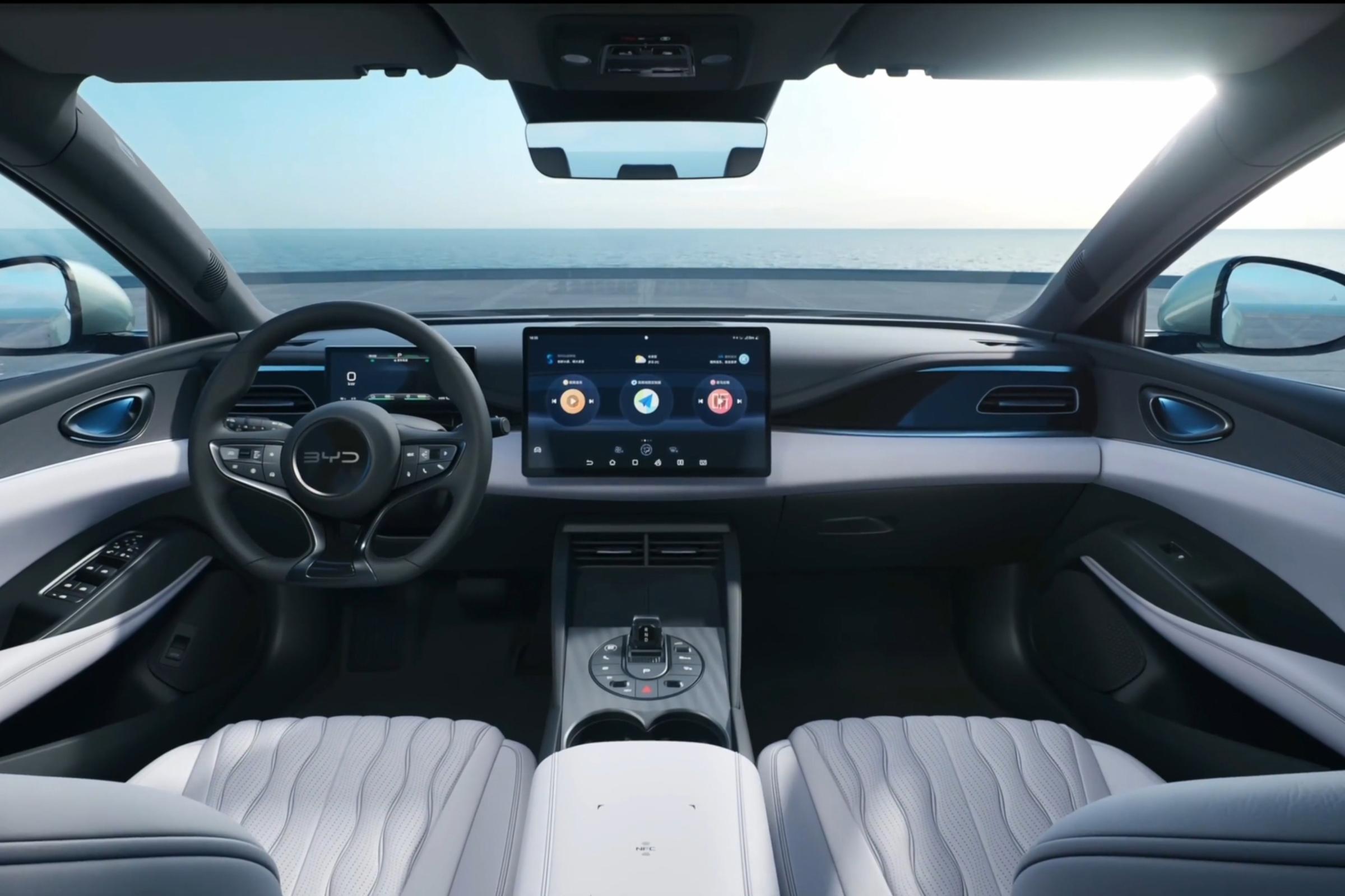 内饰部分,海豹06 DM-i采用环抱式设计,车内配备8.8英寸悬浮式液晶仪表和三辐样式平底方向盘,悬浮式中控屏根据配置不同提供12.8英寸和15.6英寸两种规格,内置DiLink智能网联系统,提供智能语音、智能进入等多种功能。