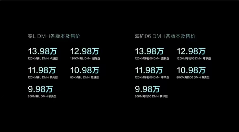 本次发布会上,搭载第五代DM技术的秦L DM-i与海豹06 DM-i两款车型正式上市,两款新车上市即交付,采用双车同价策略,均推出5款车型,售价区间均为9.98万元-13.98万元。