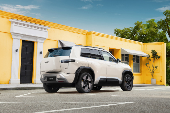 车身侧面,新车线条和轮廓较为柔和,配备隐藏式门把手和侧开式尾门设计,车门底部则采用梯形的装饰线条并配有黑色的防擦装饰。尺寸方面,新车长宽高均为4605/1900/1720mm,轴距2745mm。车尾部分,新车尾灯造型与前脸形成相呼应,提升辨识度。另外,新车还采用两段式扰流板并提供半包裹式备胎和外挂式储物箱两种造型选择,加上后包围粗犷的越野风格,整体设计给人独具特色的感觉。
