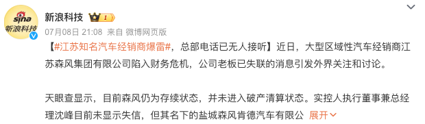 据《界面新闻》、《新浪科技》等多家媒体报道,江苏盐城市最大汽车经销商森风集团有限公司疑似遭遇重大财务危机,集团老板沈峰已失联。另据知情人士透露,森风集团资金链断裂,已拖欠员工超4个月的工资和社保,累计金额达千万元人民币。目前森风集团旗下资产已被抵押。与此同时,社交媒体也有网友爆料,森风集团负责人失联后,车辆不能进行正常的上牌流程,但仍需按月偿还贷款。