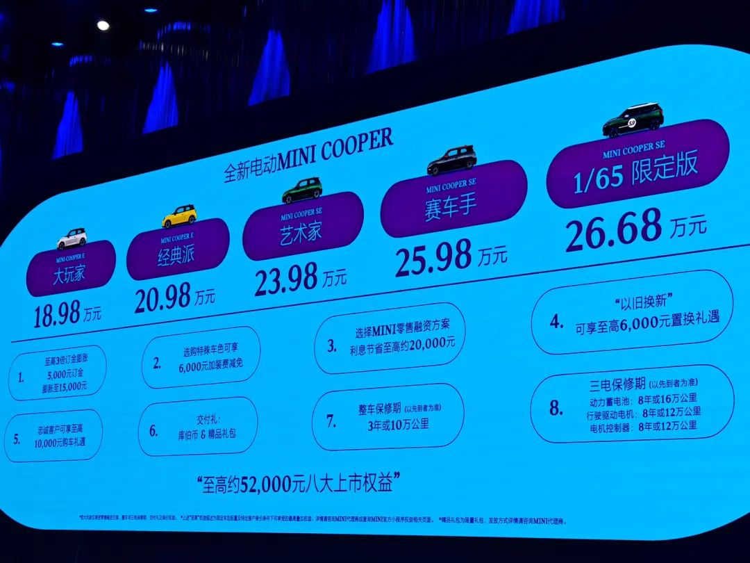 MINI中国官方宣布,自10月18日起,全新电动MINI COOPER售14.88万元起,相比于原先的18.98万元起的起售价降低4.1万元;全新电动MINI ACEMAN售16.39万元起,相比于原先的20.99万元起的起售价降低4.6万元。与此同时,针对已购买上述两款纯电车型的老车主,MINI中国将实行现金形式的保价。