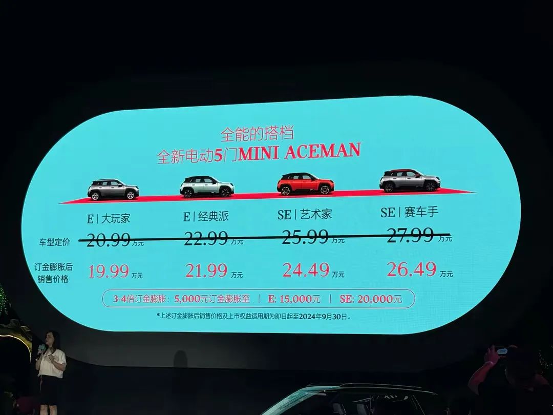 MINI ACEMAN同样取消了大玩家入门款车型,调整后,ACEMAN E 经典派车型售16.39万元,相比于原先的22.99万元下调6.6万元;ACEMAN SE 艺术家车型售19.79万元,相比于原先的25.99万元下调6.2万元;ACEMAN SE 赛车手车型售20.99万元,相比于原先的27.99万元下调7.0万元。