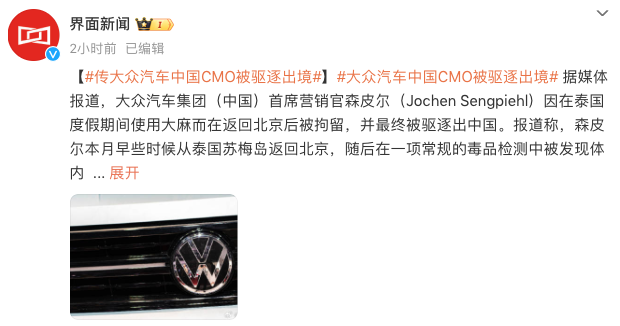 据多家媒体报道,大众汽车集团(中国)首席营销官森皮尔(Jochen Sengpiehl)被驱逐出中国,原因是其在泰国吸食大麻。报道称,两周前,森皮尔从泰国苏梅岛度假返回北京,随后在常规毒品检测中被发现体内含有大麻成分,因此被拘留十多天,后被释放,但条件是其必须离开中国。这一事件曝光后很快引发业内人士广泛的关注和讨论。