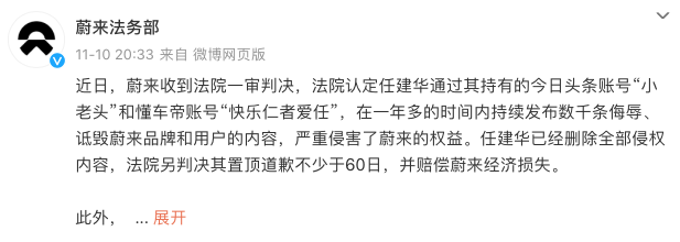 11月10日,蔚来法务部发文,蔚来收到法院一审判决,法院认定任建华通过其持有的今日头条账号“小老头”和懂车帝账号“快乐仁者爱任”,在一年多的时间内持续发布数千条侮辱、诋毁蔚来品牌和用户的内容,严重侵害了蔚来的权益。任建华已经删除全部侵权内容,法院另判决其置顶道歉不少于60日,并赔偿蔚来经济损失。此外,对于其他恶意攻击蔚来和乐道的内容,蔚来也已经全部固定证据,并均已采取包括诉讼在内的法律行动,会适时向社会公众公布进展。