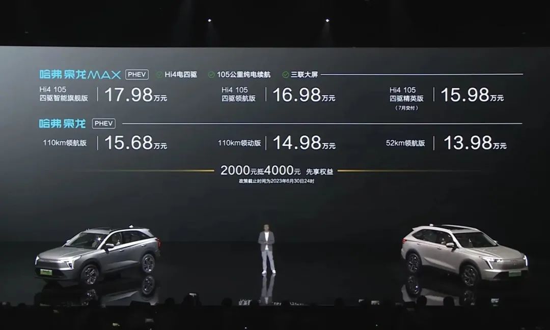 哈弗是长城汽车旗下品牌,而哈弗枭龙MAX则是哈弗旗下一款新能源紧凑级SUV车型,该车基于长城汽车最新的混动平台打造,于2023年5月上市,彼时,哈弗枭龙与枭龙MAX上市,其中,哈弗枭龙定位紧凑型SUV,共推出3款车型,售价区间为13.98-15.68万元;枭龙MAX定位中型SUV,同样推出3款车型,售价区间为15.98-17.98万元,是首款搭载Hi4智能电混四驱系统的车型。