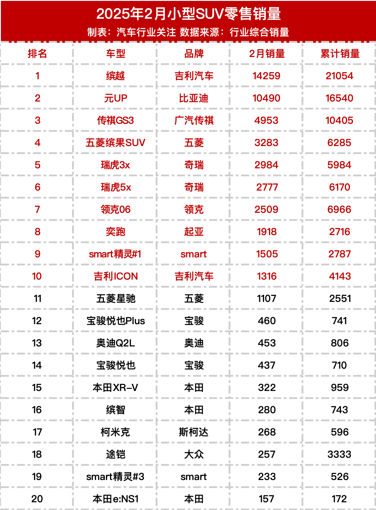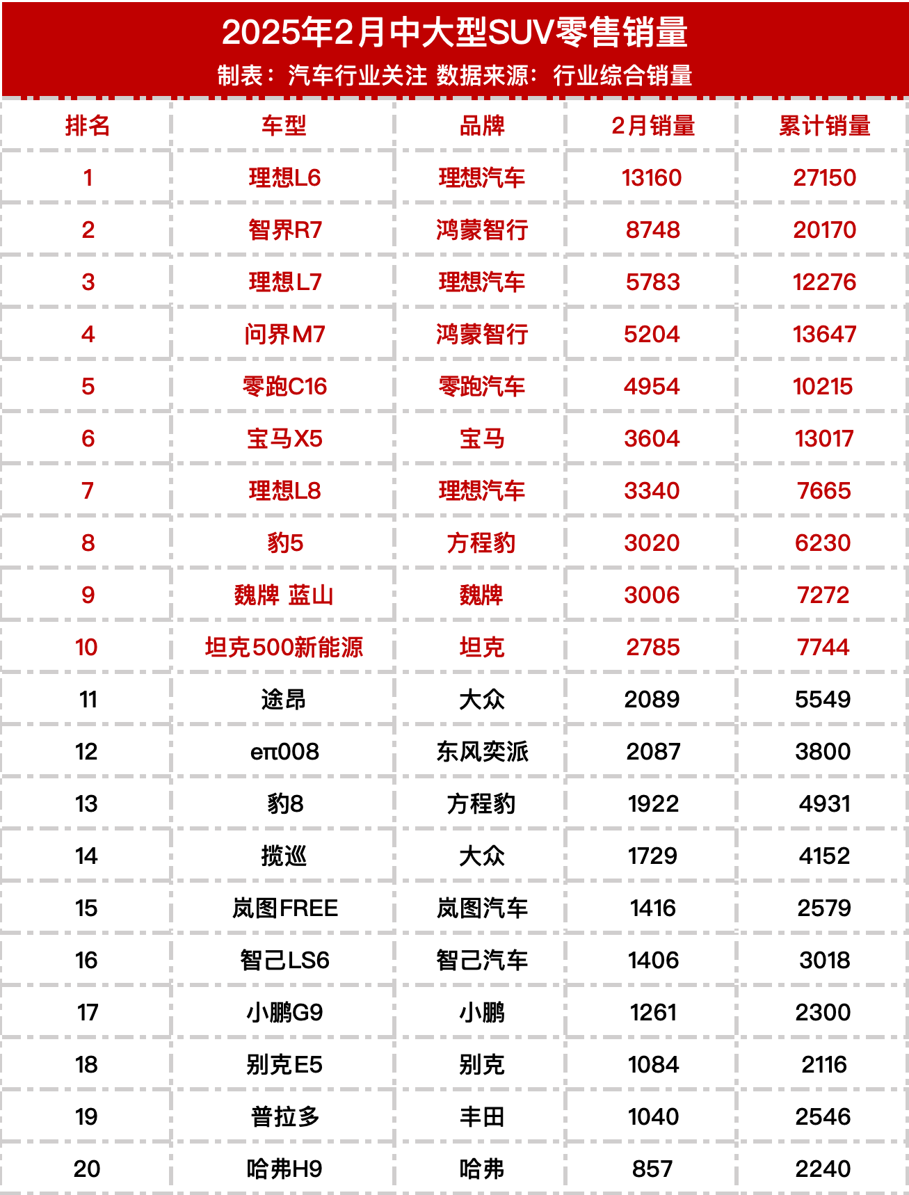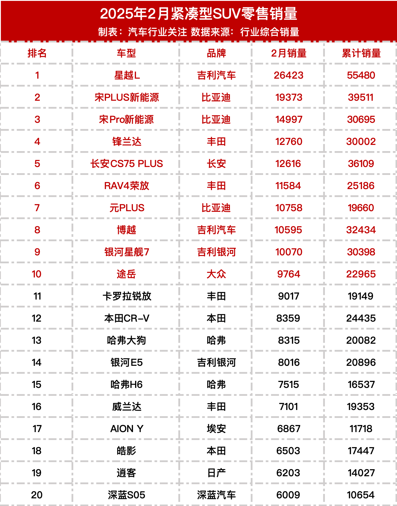 2025年2月SUV零售销量榜