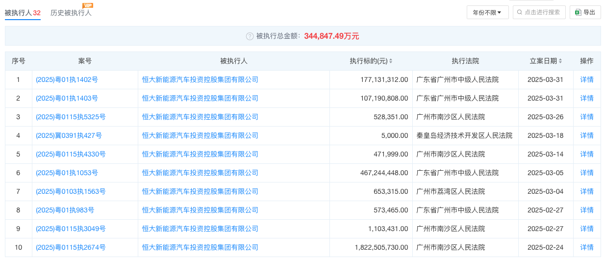 与此同时,恒大汽车还面临诸多官司。3月31日,天眼查信息显示,恒大新能源汽车投资控股集团有限公司新增2则被执行人信息,执行标的合计2.8亿余元,涉及融资租赁合同纠纷案件,被执行人还包括恒大集团有限公司、恒大恒驰新能源汽车(上海)有限公司等,执行法院为广东省广州市中级人民法院。