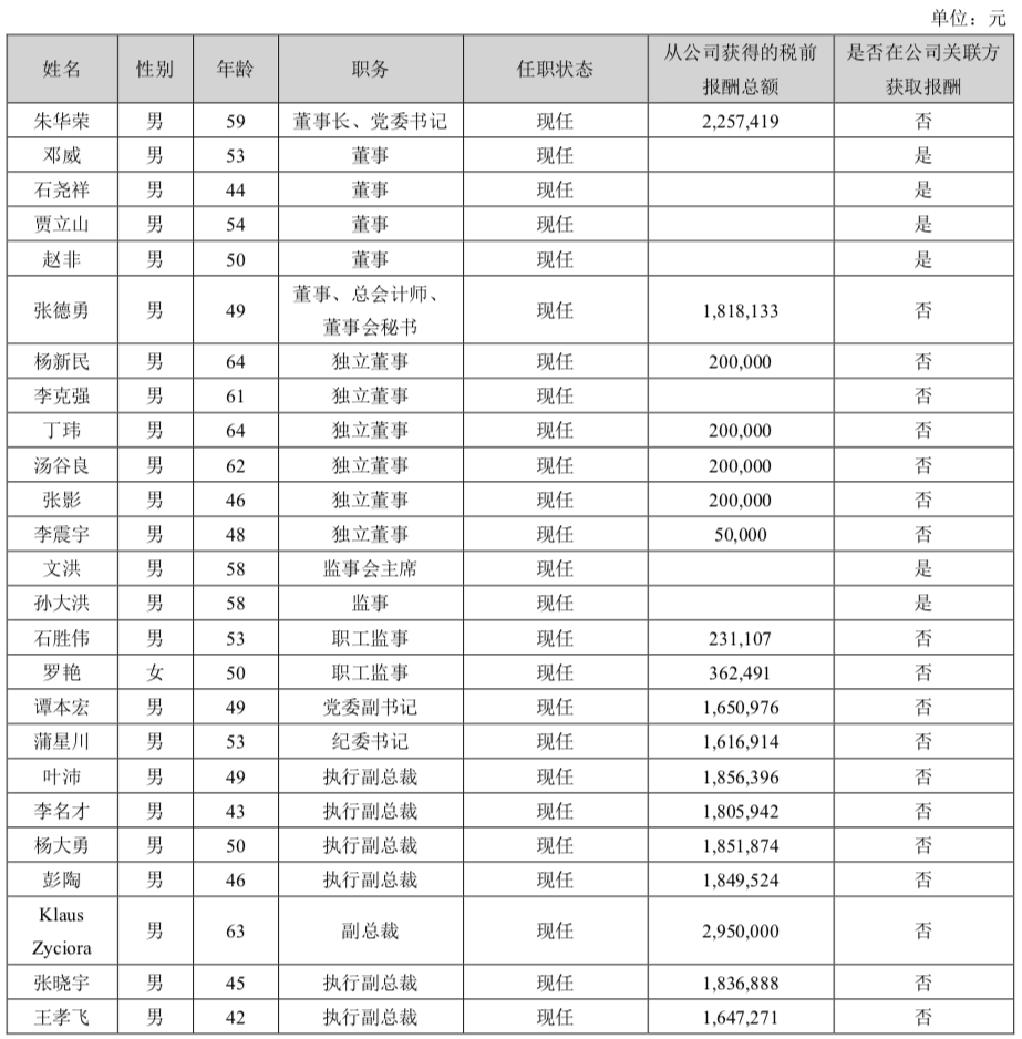 作为对比,2023年包括董事长朱华荣和总裁王俊在内共有9名管理层薪酬达200万以上,其中,董事长朱华荣和总裁王俊均为263万元,另有七名管理层薪酬超过百万。