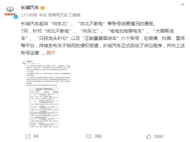 相关事件回顾:2023年7月长城汽车官方发文宣布,正式启动针对“向北不断电”、“向东北”、“大眼哥说车”、“正能量爱国说车”、“只投龙头BYD”、“电电加电聊电车”六个账号的诉讼程序,鉴于六个账号均存在涉嫌严重侵权行为,将向上述账号运营主体分别索赔200万元-500万元。从官方公布的赔偿诉求来看,对“向北不断电”的赔偿要求是300万。
