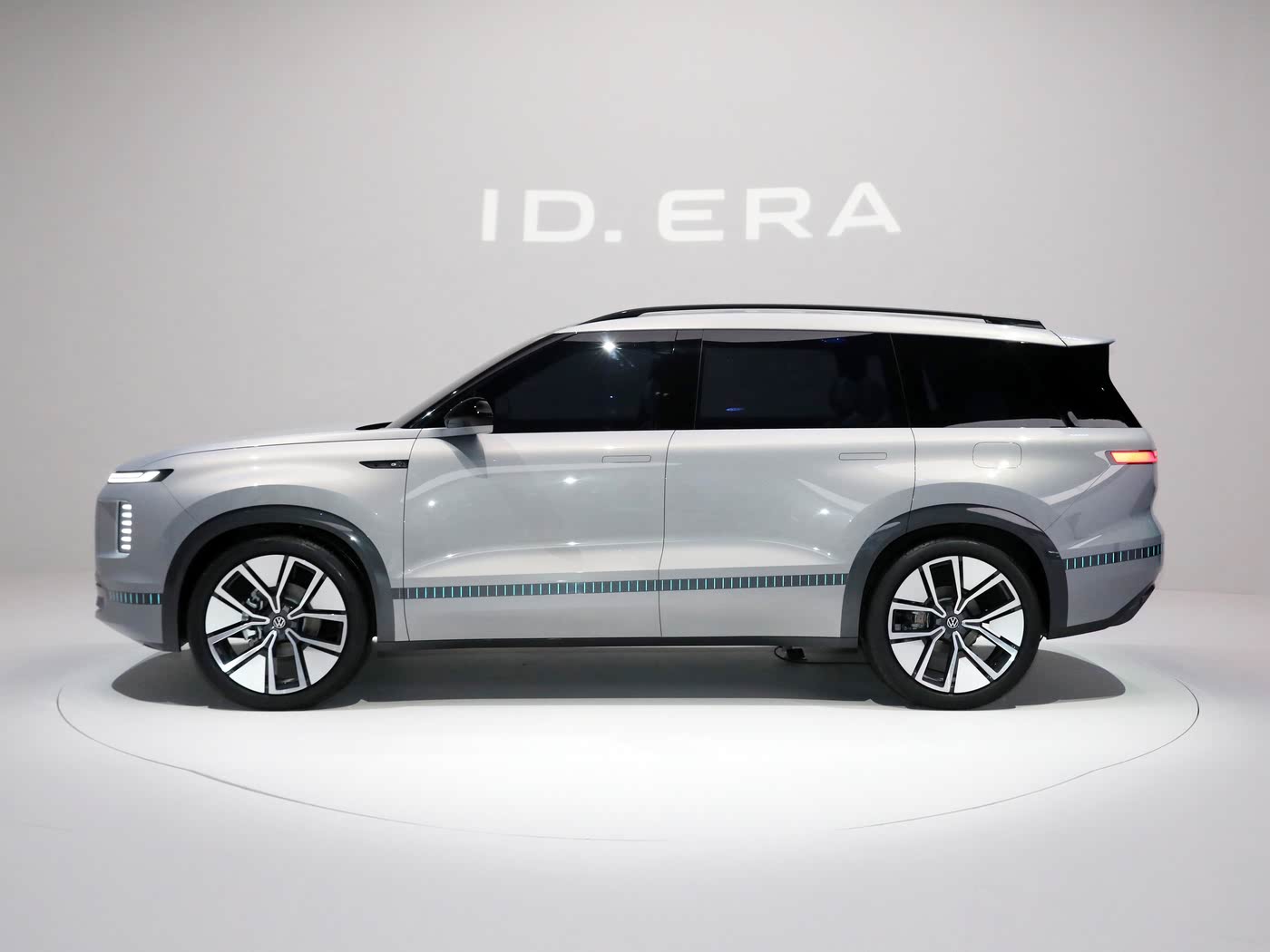 车身侧面,大众ID. ERA概念车对ABCD柱进行黑化处理,呈现出悬浮车顶的视觉效果,同时前后包围以及车门下边缘均使用可发光的装饰件。作为未来量产后尺寸最大的SUV,大众ID. ERA概念车的车侧高身,线条舒展而富有力量感。车尾部分,大众ID. ERA概念车设计贯穿式尾灯组,与大灯风格相呼应,并配备有后扰流板以及高位刹车灯。同时,该车尾标可点亮,下侧为大众品牌英文标识,后包围加入高亮黑色装饰件。