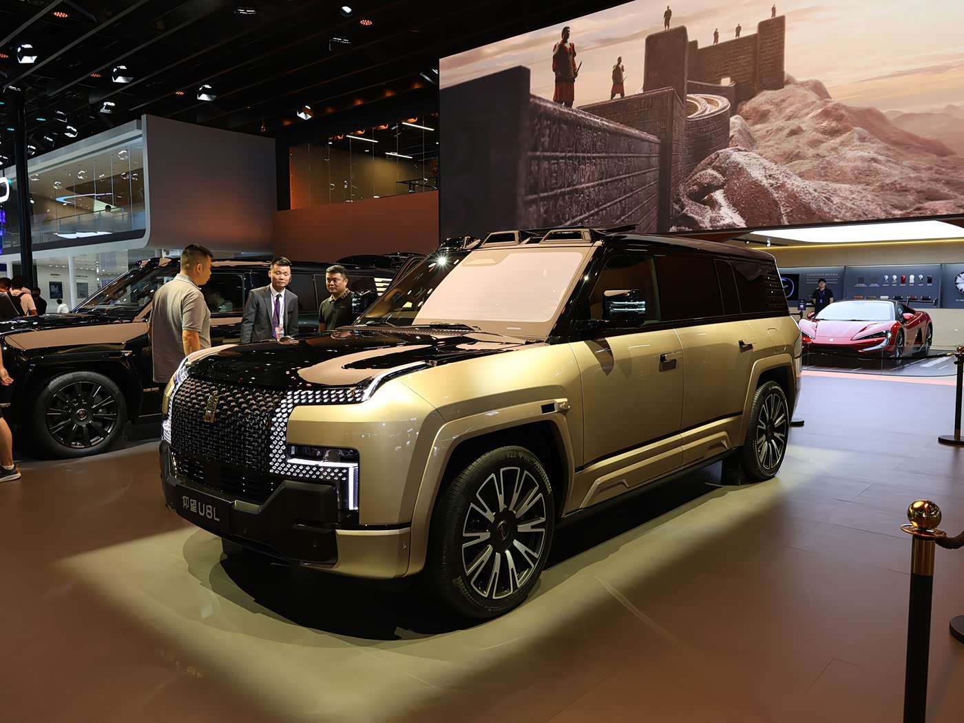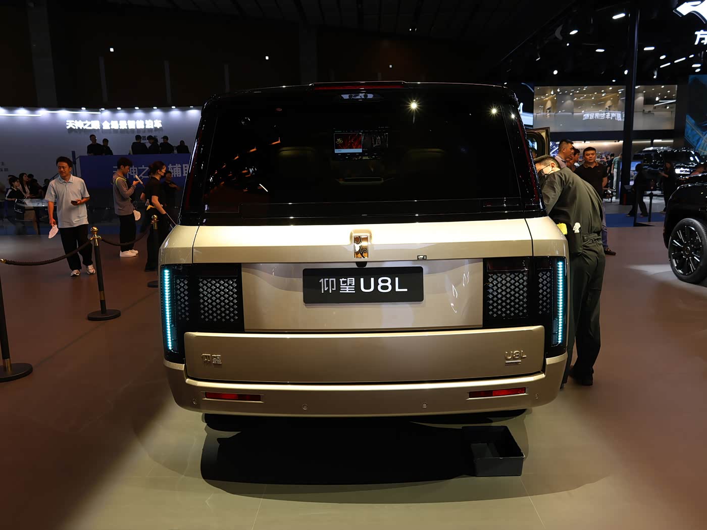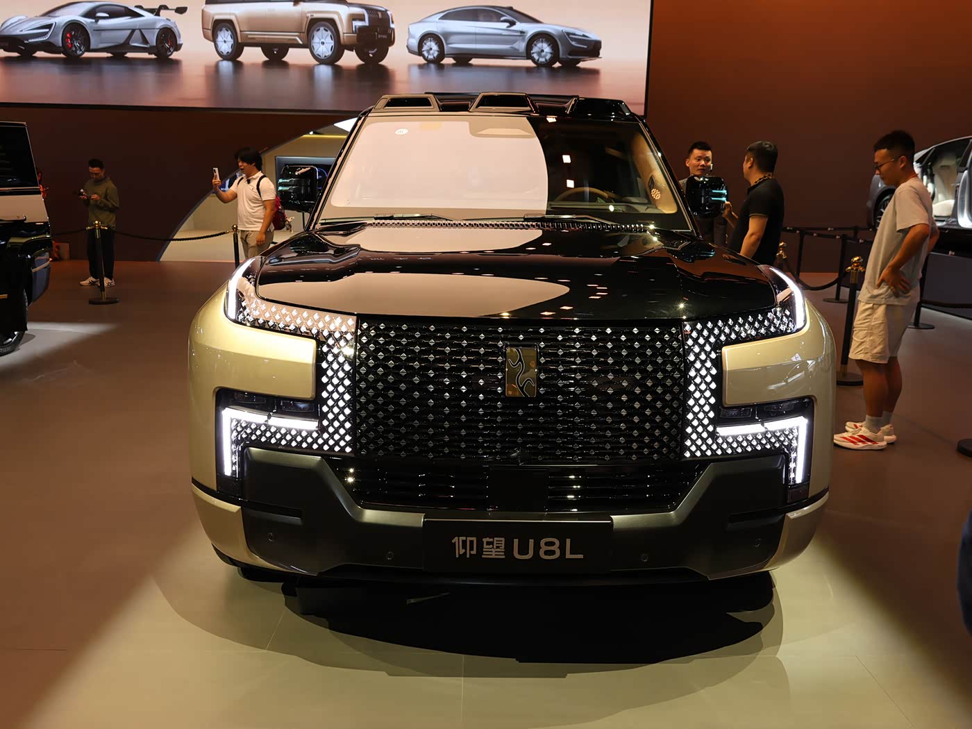 外观方面,仰望U8L整体沿用现款车型的主体设计风格,其以“鼎”为灵感来源的前脸设计语言,搭配点阵式LED光源及星际穿越大灯,中央镶嵌源自于甲骨文的“电”字的仰望品牌LOGO,点亮后增强车辆的辨识度。值得一提的是,仰望U8L前后配备的车标材质采用24K真金打造,提升其尊贵感。车身配方面,仰望U8L提供5款车身颜色,包括曜石黑配日曜金、曜石黑配日珥金两种专属黑金配色,以及曜石黑、萤石白、龙石绿等基础车身颜色。