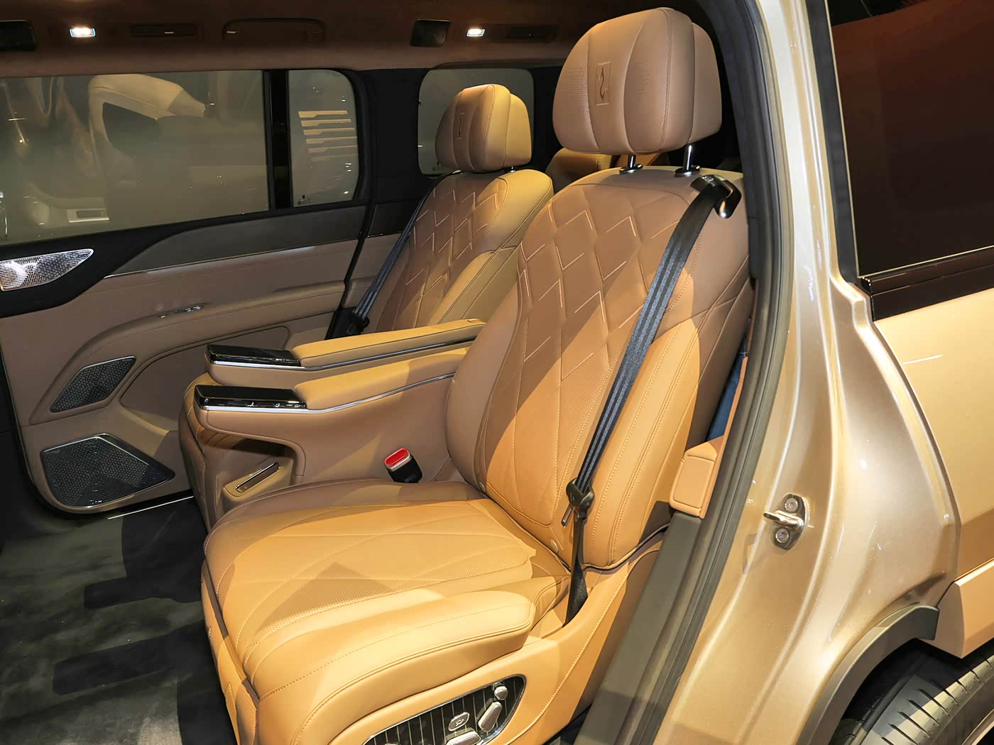 仰望U8L采用2+2+2式6座布局,车内座椅均采用Nappa真皮材质包覆,主副驾座椅配备电动可伸缩式腿托,第二排则为零重力座椅,内侧扶手带有扶手屏,下方还提供USB接口、手机无线充电等。另外,第二排座椅配备电动腿托,并支持一键零重力模式、18点式按摩等功能。车辆第三排座椅还提供带加热功能的中央扶手。