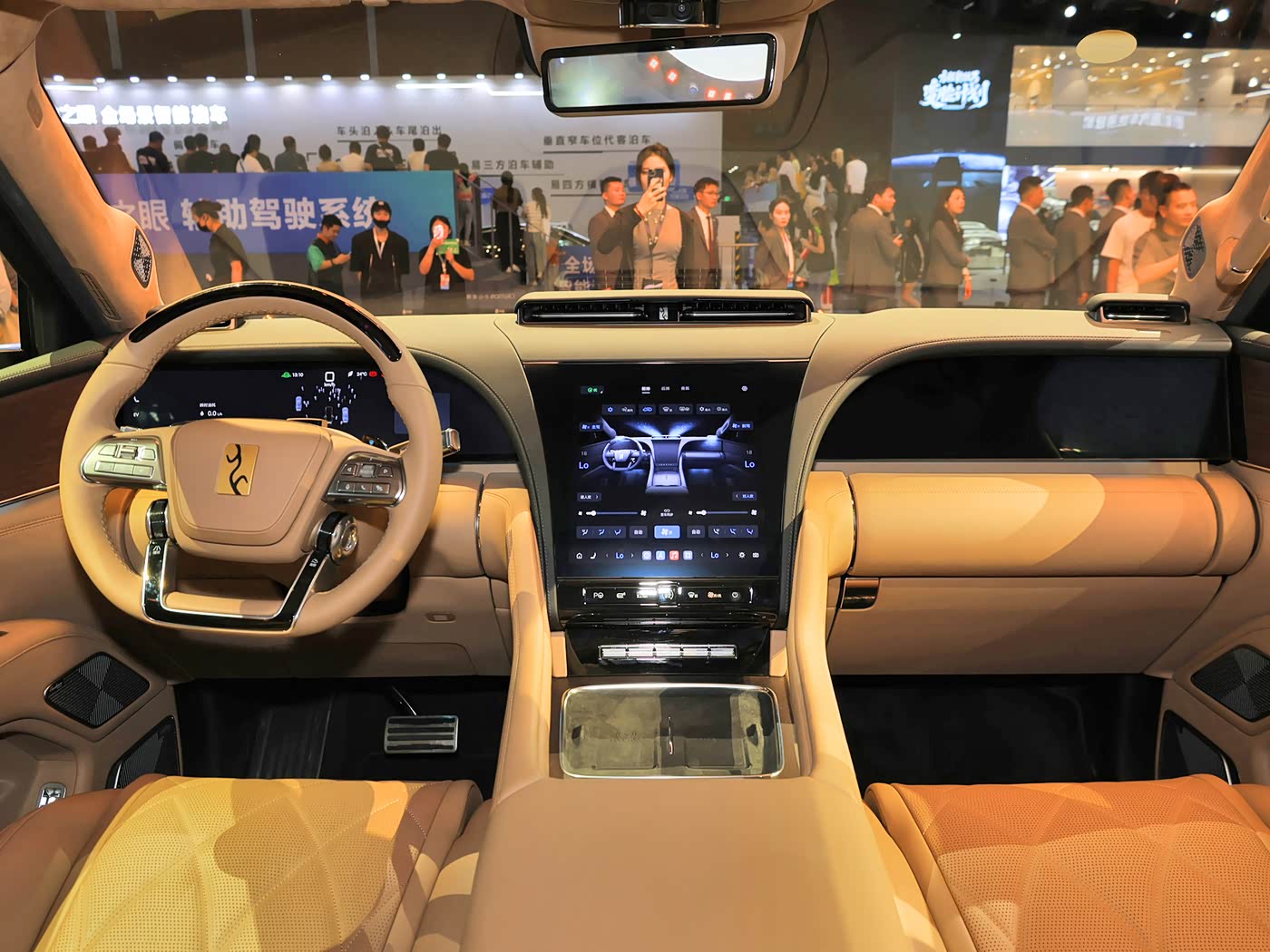 内饰方面,仰望U8L采用对称式设计,提供黑棕和紫灰两种配色,黑棕内饰搭配黑胡桃木饰板,紫灰内饰则搭配柚木饰板,配备羊毛材质脚垫、麂皮顶篷等凸显车辆豪华定位的配置。中控台配备12.8英寸OLED曲面屏,两侧还布局有贯穿式设计的23.6英寸仪表盘和副驾多媒体屏,以及AR-HUD抬头显示系统。新车配备四辐式电容方向盘,并应用怀挡式换挡机构。副仪表台区域配有物理按键、手机无线充电面板等。另外,仰望U8L对空调出风口造型进行调整,中置出风口改为一体式设计。